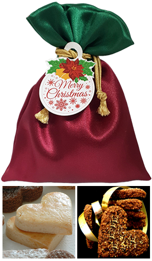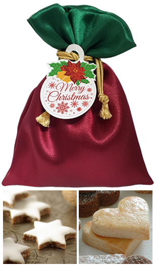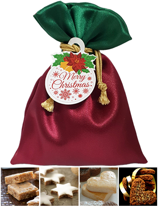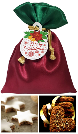CKX-18: Red and green Merry Christmas pouch filled with 4 Christmas cookies, (Basler Leckerly, Zimtstern, Mailanderli and Basler Brunsli).