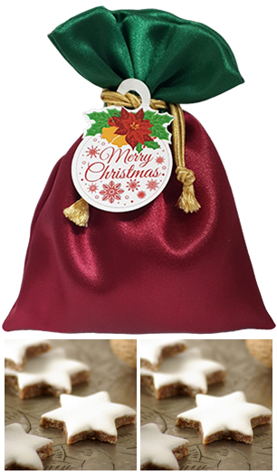 CKX-22: Red and green Merry Christmas pouch filled with 2 Christmas cookies, (2 Zimtstern).
