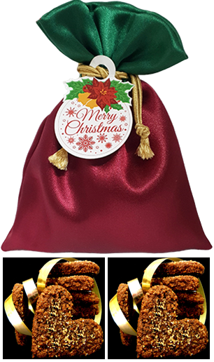 CKX-23: Red and green Merry Christmas pouch filled with 2 Christmas cookies, (2 Basler Brunsli).