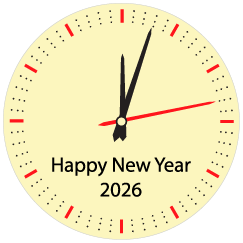X-124w: White chocolate round with Happy New Year clock graphic in black & red color. 4 cm D, 2 mm T, 50 pc/box, shelf life: 9 months.