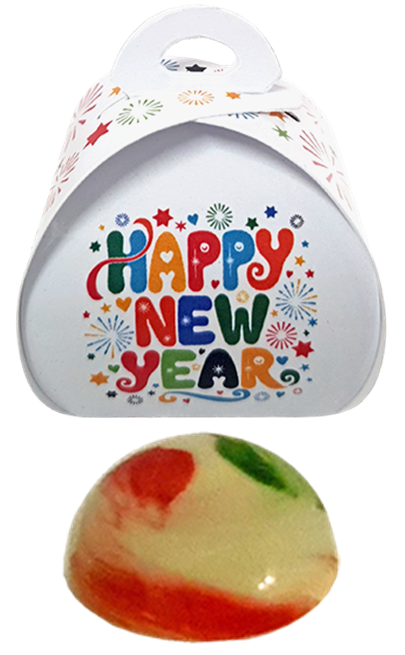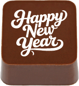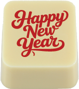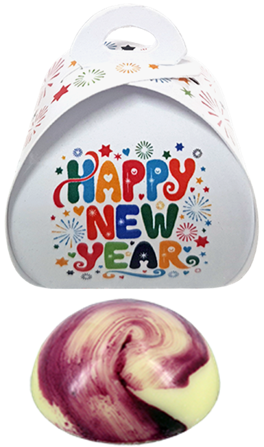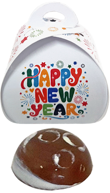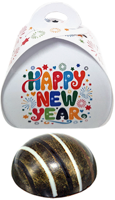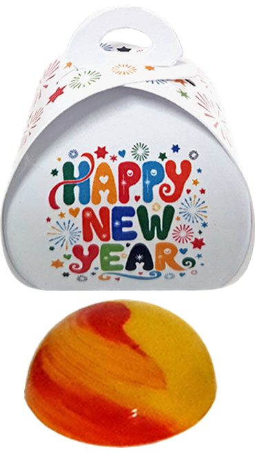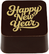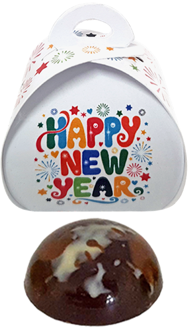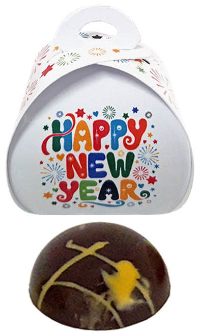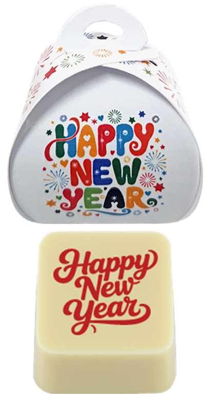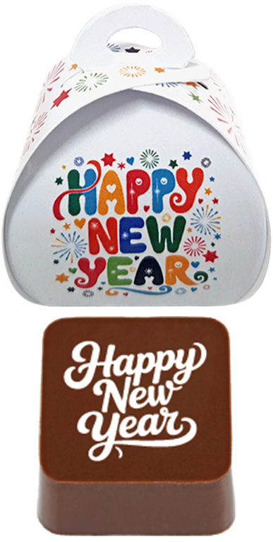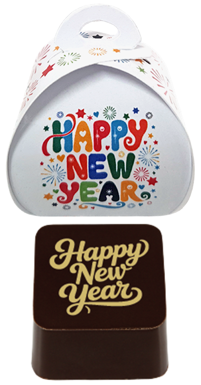 NEWY-10: Happy New Year box with 4 chocolate bonbons. 8x8x 2.5 cm, shelf life: 45 days.