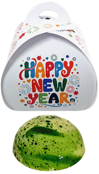 BONBON-10: Pistachio, A crispy pistachio praline with crispy flakes in a dark chocolate covering with HNY graphic in gold. 12 g, 2.8 x 2.8 x 1.4 cm, shelf life: 90 days.